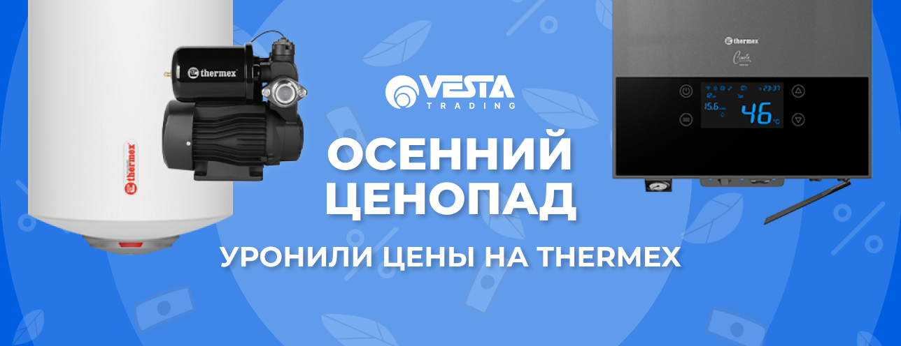 Уважаемые покупатели! В розничной сети "Веста Трейдинг" вас ждут специальные условия на покупку товаров THERMEX из подборки. Ждем вас в наших магазинах и на сайте www.vestatrade.ru..