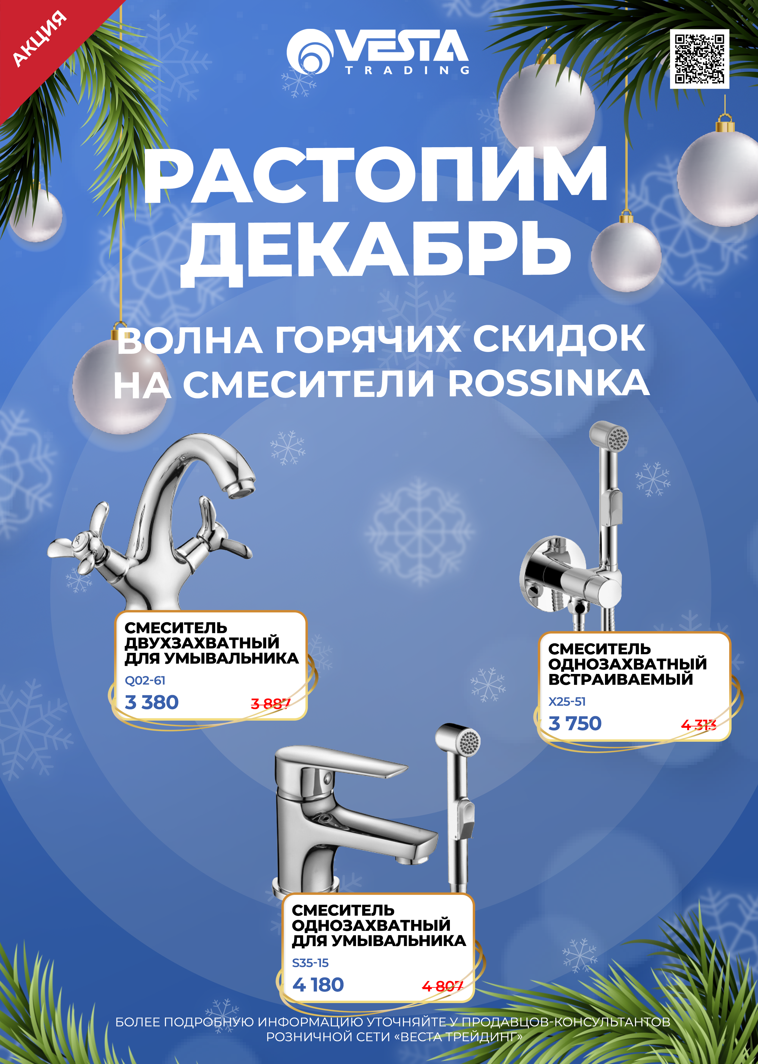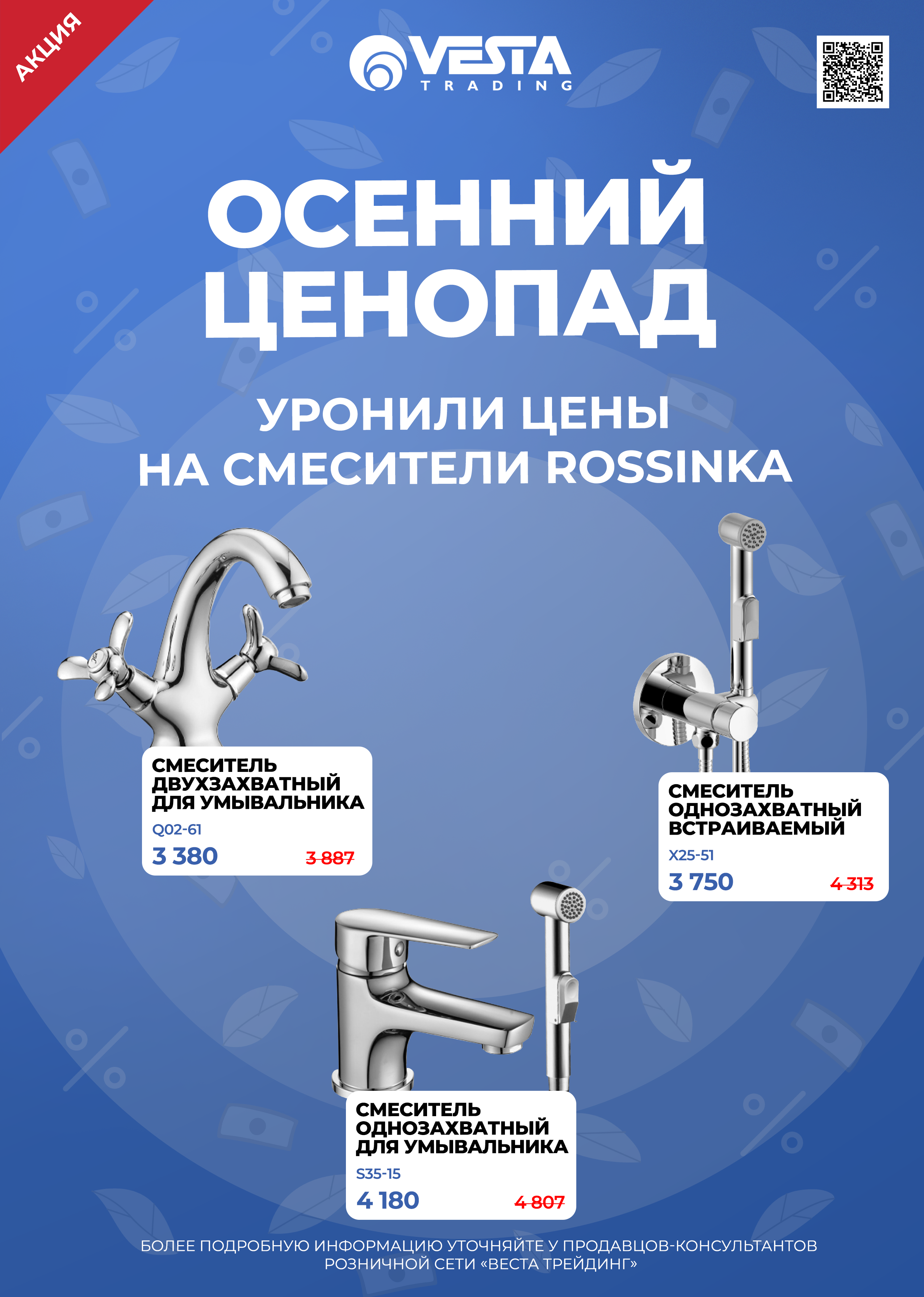 Уважаемые покупатели! В розничной сети "Веста Трейдинг" вас ждут специальные условия на покупку смесителей Rossinka из подборки. Ждем вас в наших магазинах и на сайте www.vestatrade.ru