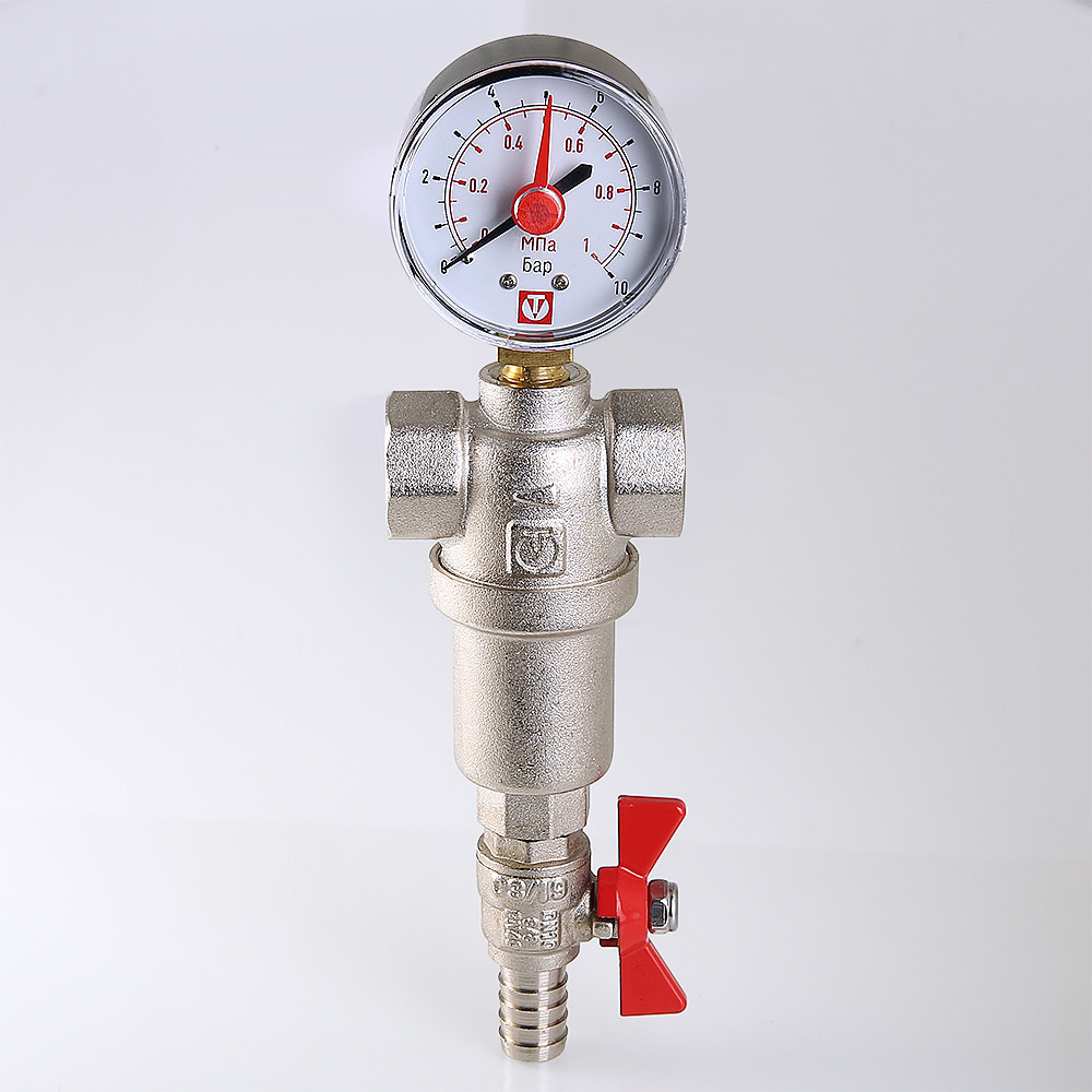 Предусмотрены дренажный шаровой кран со штуцером для подключения шланга и манометр для контроля уровня загрязненности сеток. Фильтр монтируется в вертикальном положении, колбой вниз. Резьба присоединений – внутренняя.