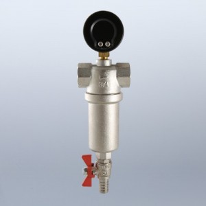 Компактный фильтр механической очистки воды с возможностью удаления накопившихся загрязнений без извлечения сетчатых вставок (промывной фильтр). Оснащен двумя (один в другом) фильтроэлементами из нержавеющей стали. Размер ячеек сетки первичного фильтроэлемента – 1000, вторичного – 250 мкм. Корпус и колба фильтра выполнены из латуни марки CW617N (европейский стандарт EN 12165), никелированы. Предусмотрены дренажный шаровой кран со штуцером для подключения шланга и манометр для контроля уровня загрязненности сеток. Фильтр монтируется в вертикальном положении, колбой вниз. Резьба присоединений – внутренняя.