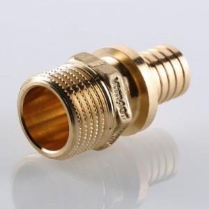 Соединитель VTm.401.BG – прямой латунный надвижной фитинг с переходом на наружную резьбу для труб из сшитого полиэтилена и полиэтилена повышенной термостойкости.