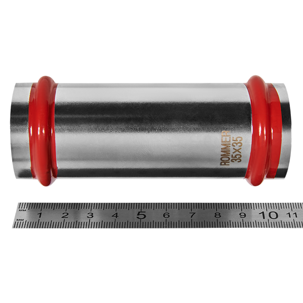 Муфта надвижная Rommer ВПр, 35, из нержавеющей стали RSS-0019-000035 соединяет трубы одного диаметра с надвижным монтажом, обеспечивает быстрый и герметичный монтаж без сварки.