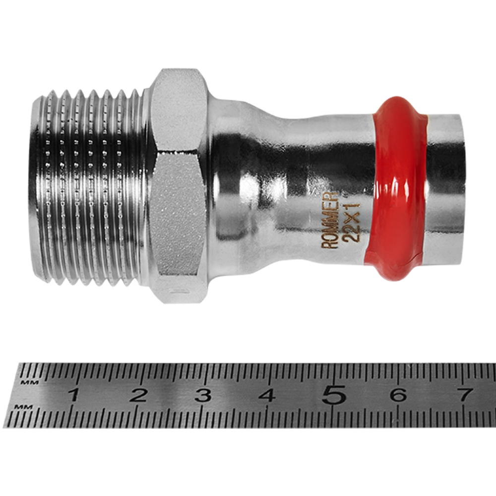 Переходник Rommer ВПр-НР, 22х1, из нержавеющей стали RSS-0021-000221 соединяет пресс-трубы с резьбовыми элементами, обеспечивает герметичность и устойчивость к механическим нагрузкам.
