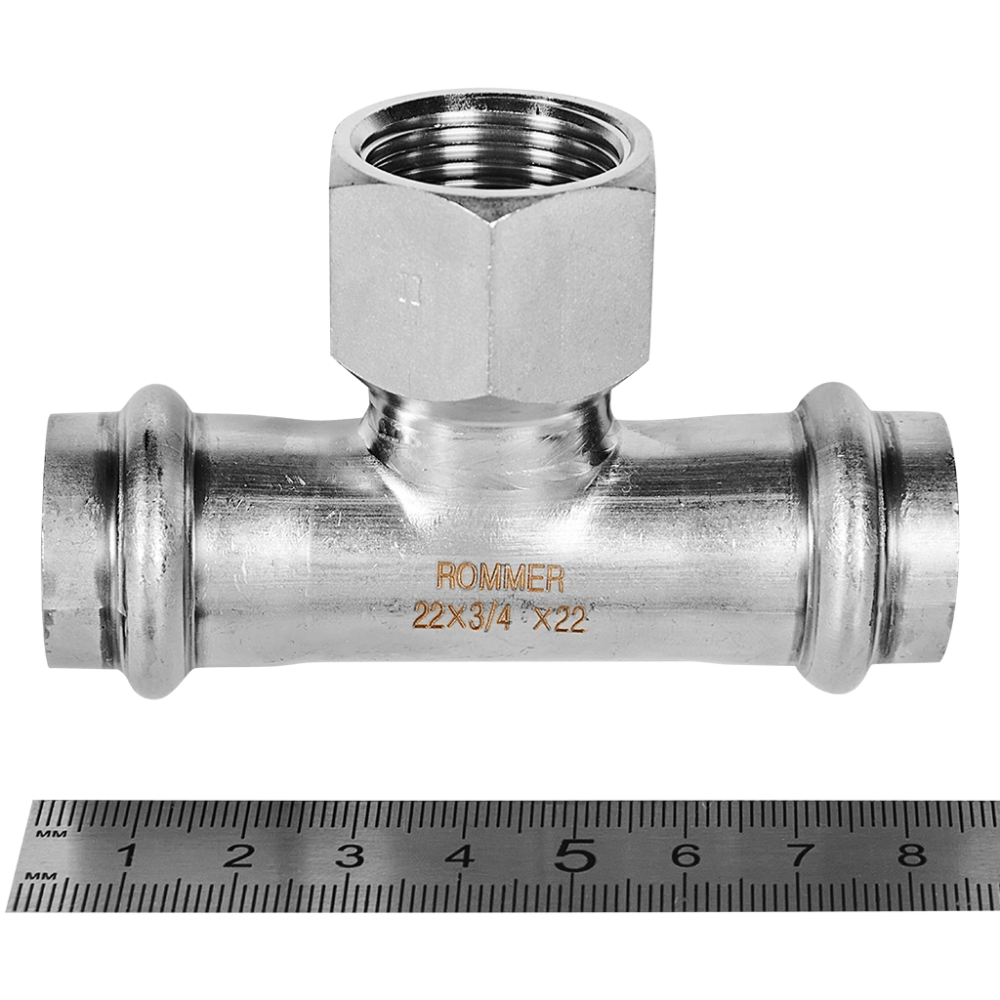 Тройник-переходник Rommer ВПр-ВР, 22х3/4, из нержавеющей стали RSS-0015-002234 разветвляет трубопровод с подключением резьбового элемента, обеспечивает надежность и герметичность.