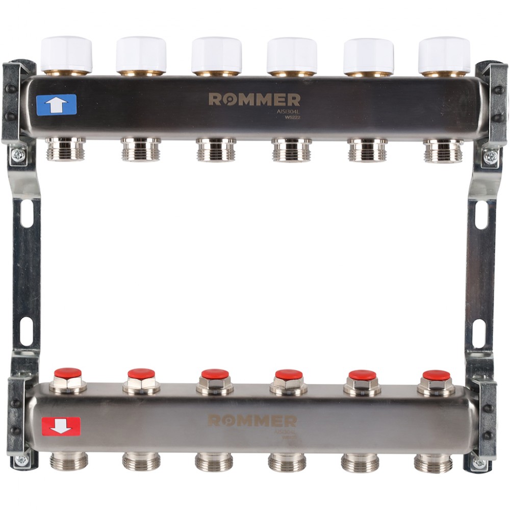 Коллектор из нержавеющей стали 1"x3/4" ROMMER без расходомеров 6 вых. RMS-3200-000006 - предназначен для улучшения производительности систем отопления зданий, за счет равномерного распределения теплоносителя по контурам.