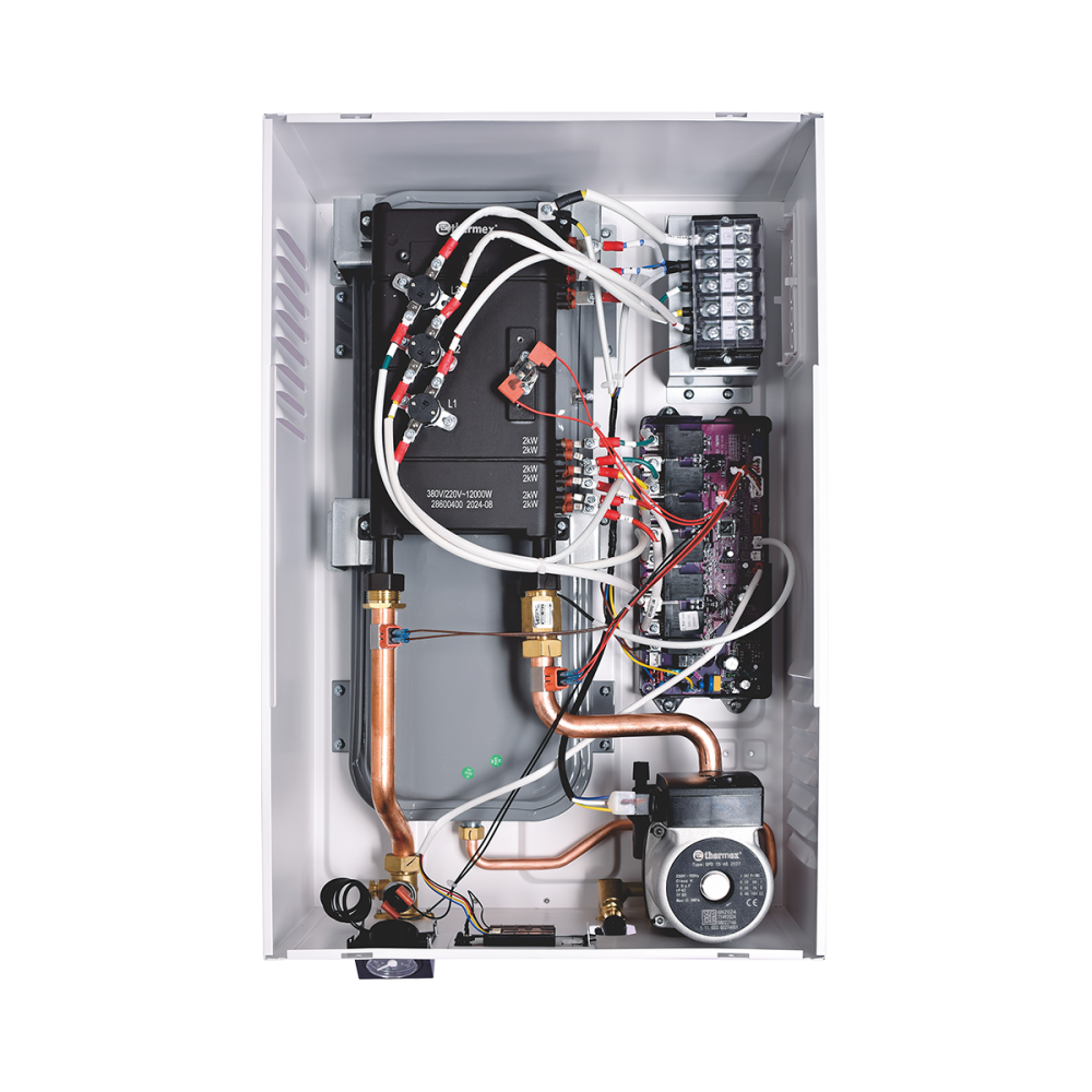 - ✓ 6 в 1. Отличительной особенностью отопительного котла Thermex Sonne является регулировка мощности, разбитая на шесть ступеней. Пользователю доступны варианты мощности 2, 4, 6, 8, 10 или 12 кВт. Настройка мощности производится через основную плату управления, и с помощью рычагов на плате можно ограничить максимальную мощность котла. При минимальной мощности котел способен обогревать помещение площадью до 50 м², а при увеличении – до 120 м². Также, электрический котел имеет универсальное подключение: к однофазной или трехфазной сети, что еще больше упрощает установку, настройку и эксплуатацию оборудования.