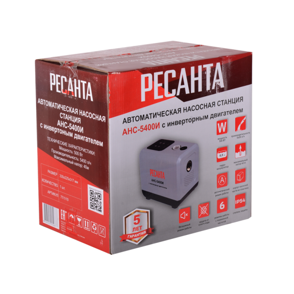 Автоматическая насосная станция Ресанта АНС-5400И с инверторным электродвигателем мощностью 500 Вт, максимальным напором 40 м и подачей 5400 л/ч (90 л/мин) предназначена для водоснабжения и повышения давления в системе в автоматическом режиме.