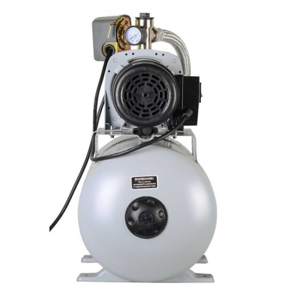 Станция выполнена с гидроаккумулятором 24 л и насосной частью в пластиковом корпусе; автоматика включает и отключает насос по мере расходования воды потребителями.