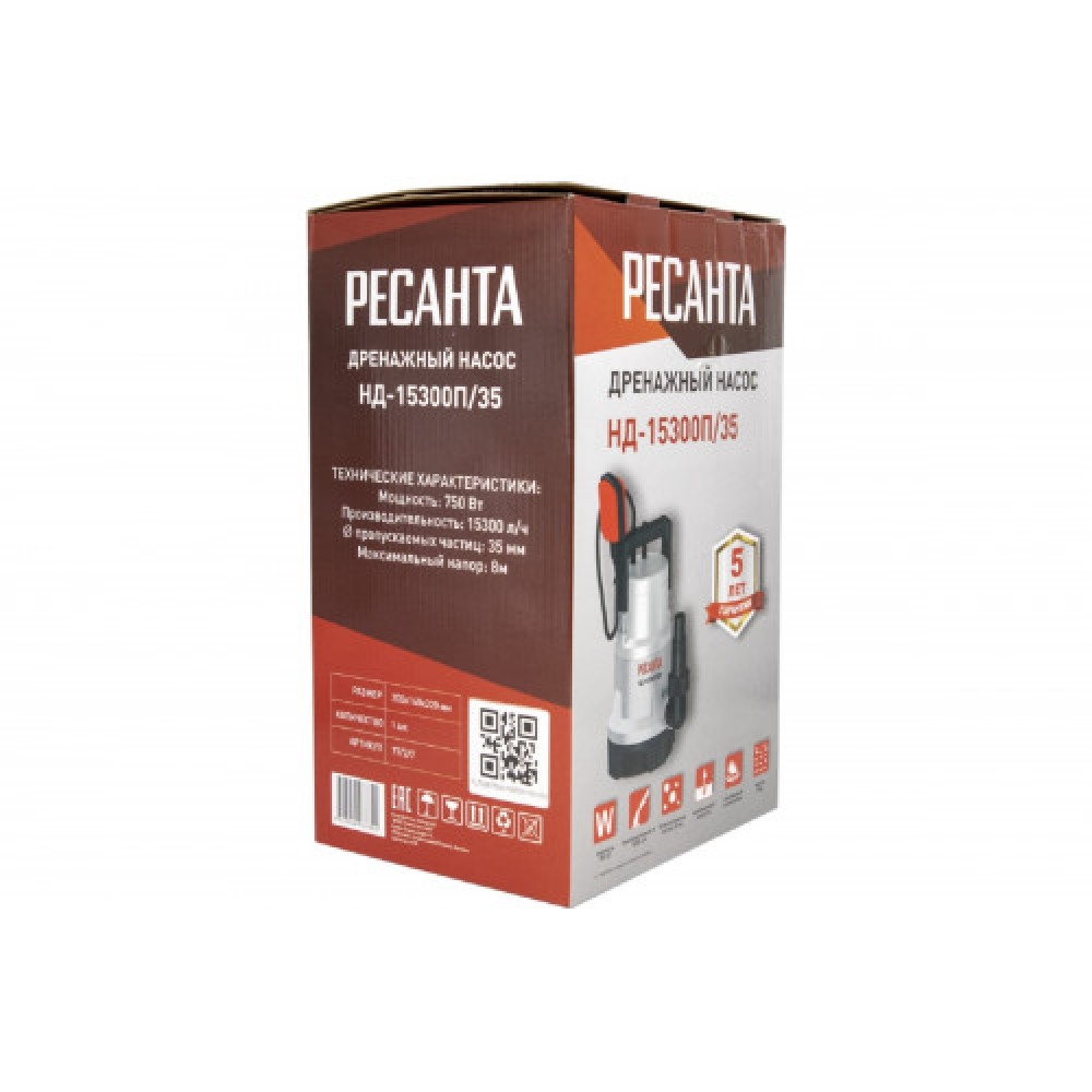 Дренажный насос Ресанта НД-15300П/35 мощностью 750 Вт и максимальной подачей 15 300 л/ч (15,3 м³/ч) предназначен для откачки воды из рек и водоемов, а также для орошения и подачи воды с глубины.