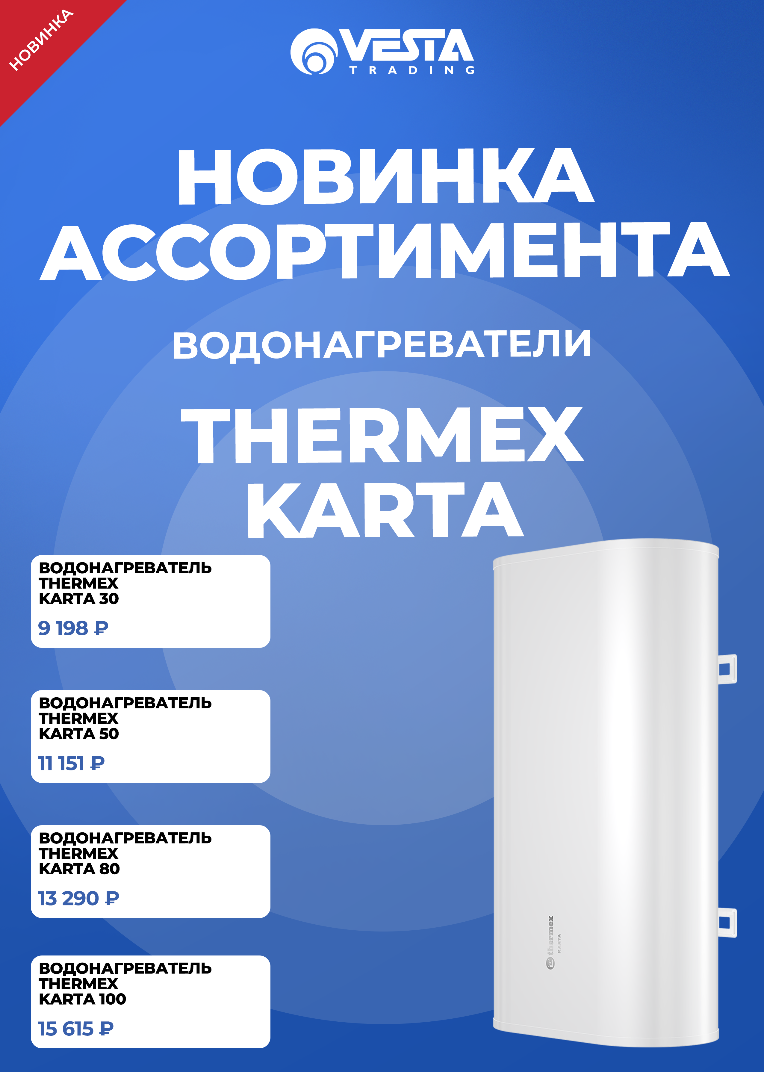 Покупая водонагреватели Thermex Karta в магазинах розничной сети «Веста Трейдинг», вы приобретаете проверенную временем технику, которая обеспечит вас комфортным горячим водоснабжением и поможет существенно сэкономить на потреблении электроэнергии.