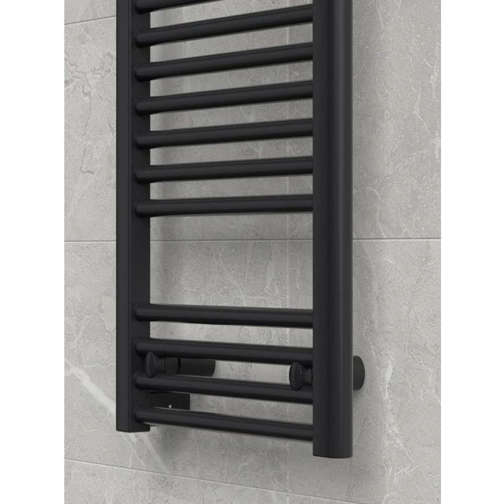 Электрический полотенцесушитель выполнен в современном дизайне и представлен в чёрном цвете. Устройство предназначено для быстрого и равномерного прогрева ванной комнаты, сушки полотенец и белья. Подходит для любых типов помещений, включая квартиры и частные дома.