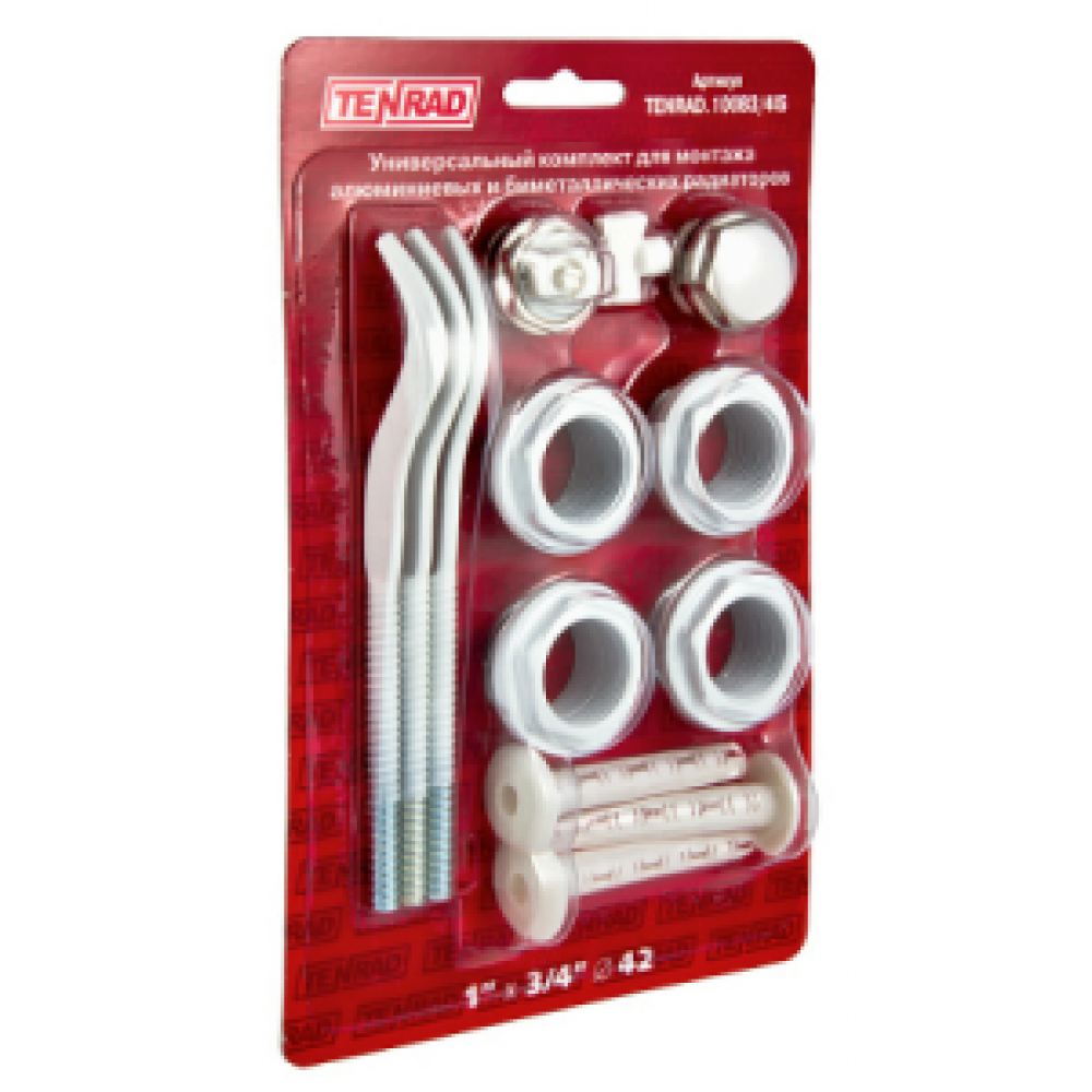Универсальные комплекты TENRAD представляют из себя полный набор необходимых деталей для монтажа алюминиевых и биметаллических радиаторов отопления при строительстве отопительных систем как в частном, так и промышленном объеме. Все детали, входящие в набор, выполнены из того же материала, что и радиаторы, они окрашены в белый цвет и в собранном виде смотрятся очень современно и эстетично.