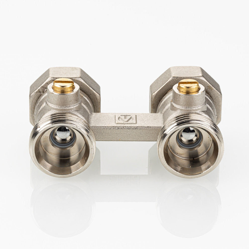 (VT.345.NE) Н-образный клапан, предназначенный для нижнего подключения отопительных приборов при расположении присоединительных патрубков с межосевым расстоянием 50 мм.